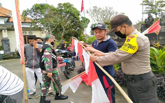 Babinsa Desa Manikliu Koramil 1626-04/Kintamani Sersan Wayan Sukadana bersama mayarakat setempat memasang bendera merah putih, umbul-umbul serta menghiasi tonggak perjuangan Desa Manikliu, Selasa (04/08/2020) kemarin.