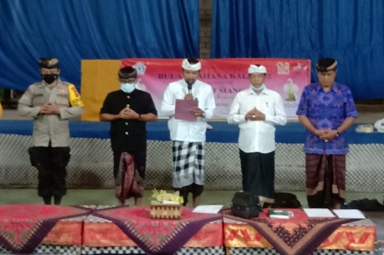 Beritafajartimur.com (Gianyar-BALI) | Bhabinkamtibmas Desa Siangan Polsek Gianyar Aiptu I Kadek Sumerta menghadiri undangan Pembukaan Bulan Bahasa Bali Desa Adat Siangan, bertempat di Wantilan Pura Puseh Desa Adat Siangan Desa Siangan, Senin (19/2) pagi.