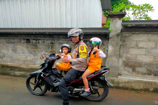 BERITAFAJARTIMUR.COM (Gianyar-BALI) | Bhabinkamtibmas Desa Sidan Aipda Ngakan Gede Sukrayana, S.H., tanamkan tertib helm dimulai dari anak usia dini di wilayah Desa Sidan, Kecamatan Gianyar, Senin (13/2) pagi.