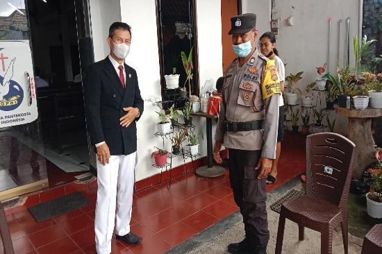 BERITAFAJARTIMUR.COM (Gianyar-BALI) | Dalam memberikan rasa aman kepada masyarakat, Bhabinkamtibmas Kelurahan Gianyar Aiptu I Gusti Ngurah Gede melaksanakan pengamanan Ibadah di Gereja Pantekosta Bukit Zaitun, Jl. Pasung Grigis No 20 Gianyar, Minggu (6/11) pagi.