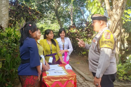 Bhabinkamtibmas Desa Singakerta Polsek Ubud Polres Gianyar, AIPTU I Made Widastra menyambangi sekelompok pelajar SMP yang sedang berkumpul sekaligus memberikan pesan pesan Kamtibmas pada Kamis, 27 Juli 202e pukul 9.00 Wita.