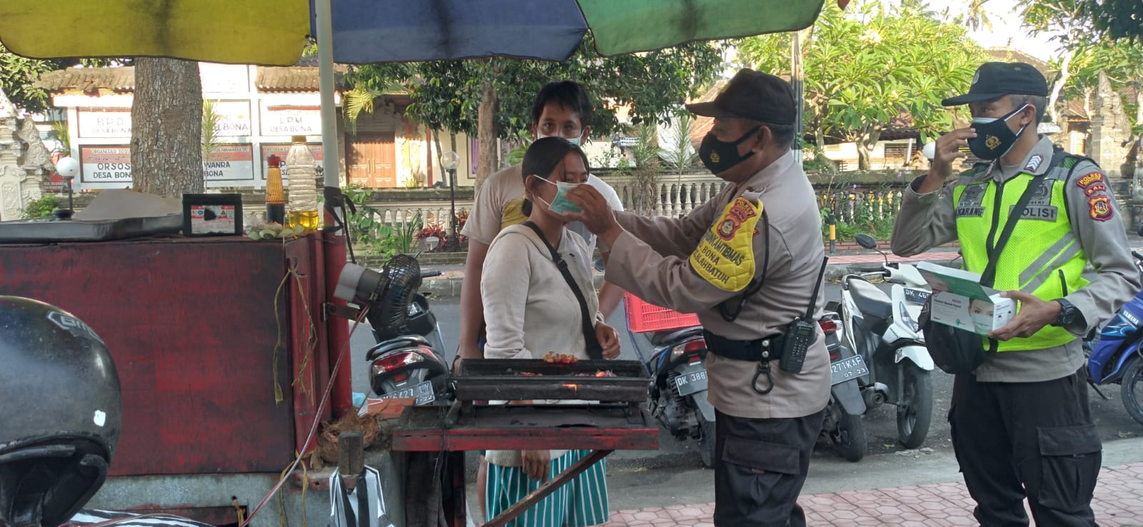 Sejalan dengan program inovatif Kapolres Gianyar terkait Kring Polri Polres Gianyar Minggu,31/10 personel Kring Polri bersama Bhabinkamtibmas Bona Aiptu I Wayan Miasa “blusukan” ke pasar yang berada di depan Kantor Perbekel Bona.Tampak personel Polri membagikan masker kepada masyarakat pedagang dan pengunjung pasar di desa setempat.