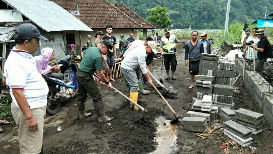 Dandim 1626/Bangli, Letkol Himawan Teddy Laksono terjun langsung membantu warga membersihkan lumpur sisa banjir di Banjar Ulun Danu Songan Kintamani, Jumat petang (07/02/2020).