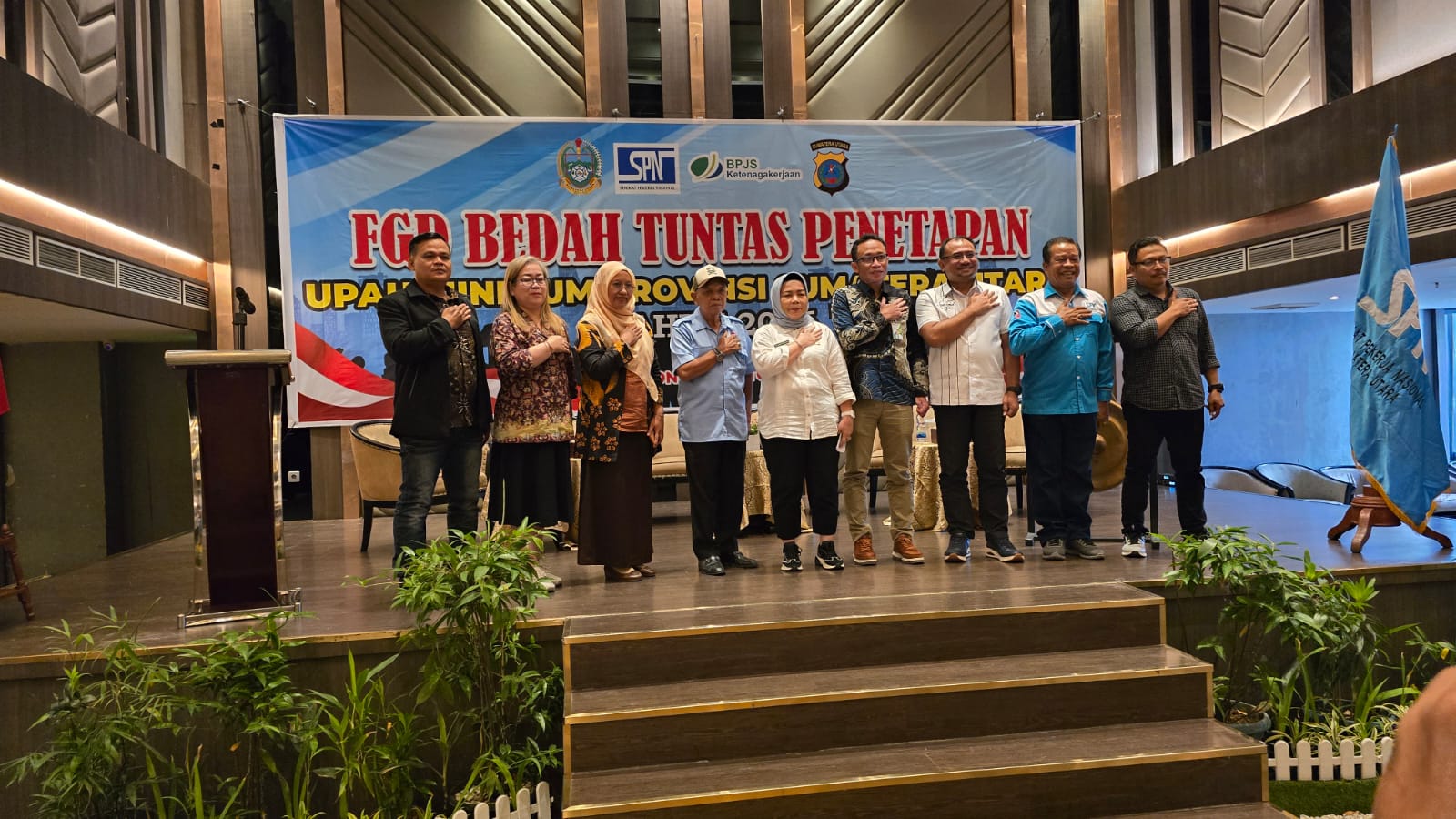 Hadir dalam FGD tersebut, Kepala Dinas Tenaga Kerja Sumut, Ir Yuliani Siregar MAP, Dir Intelkam Poldasu, Kombes Pol Decky Hendarsono, Kakanwil BPJS Ketenagakerjaan Sumbagut, I Nyoman Suarjaya para Narasumber diantaranya, Pengamat Buruh, Hawari, SH, MH, Pakar Hukum Ketenagakerjaan yang juga Wadek I Fakultas Hukum USU, Dr Agusmidah, SH, MH, Sekretaris Eksekutif DPP Apindo Sumut, Bambang Hermanto, SH, MH dan Ketua DPD KSPSI, CP Nainggolan, SE,MAP.