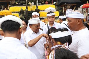 Bertempat di Pura Merajan Kanginan, Gubernur asal Desa Sembiran, Buleleng ini tidak hanya hadir untuk persembahyangan, tetapi juga secara aktif terlibat dalam megambel (menabuh gamelan) bersama para pemedek. Tarian sakral Topeng Sidakarya yang dipentaskan di Jaba Pura pun semakin hidup dengan alunan gamelan yang dipimpin langsung oleh orang nomor satu di Bali tersebut.