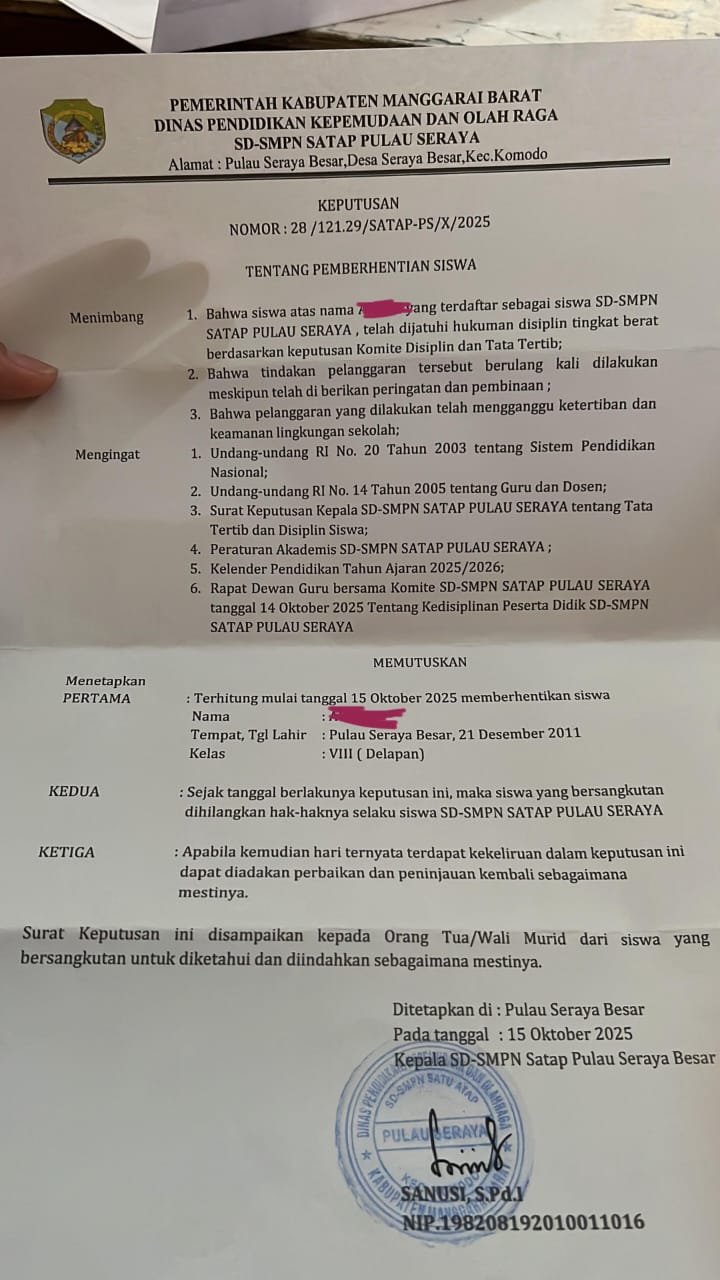 Surat keputusan pemberhentian itu ditandatangani Kepala Sekolah SD-SMPN Satap Pulau Seraya, Sanusi, pada 15 Oktober 2025, dengan Nomor: 28/121.29/SATAP-PS/X/2025. Dalam surat tersebut, A dinyatakan melakukan pelanggaran disiplin berat berdasarkan keputusan komite sekolah.