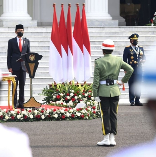 Beritafajartimur.com (Jakarta) | Perayaan puncak HUT ke-76 TNI diperingati dengan cara sederhana di Istana Merdeka, Jakarta, Selasa (5/10/2021) lalu dengan tema “Bersatu, Berjuang Kita Pasti Menang”. Presiden RI, Ir. Joko Widodo bertindak sebagai inspektur upacara, dengan didampingi oleh Wakil Presiden RI KH Ma’ruf Amin, Menteri Pertahanan Prabowo Subianto, Panglima TNI Marsekal Hadi Tjahjanto, Kapolri Jenderal Pol. Listyo Sigit Prabowo, beserta Kepala Staf dari tiga Matra TNI.