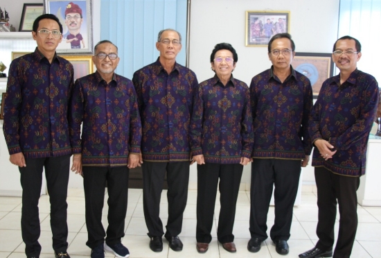 Foto: Para pengurus Yayasan Widya Dharma Shanti Denpasar dan pendiri ITB STIKOM Bali. I Made Marlowe Bandem, B.Bus (Wakil Ketua Yayasan), Drs. Satria Dharma (Pengawas Yayasan dan Pendiri), Ir. I Wayan Swastika, MT (Pengawas Yayasan), Prof. Dr. I Made Bandem, MA (Pembina Yayasan dan Pendiri), Drs. Ida Bagus Dharmadiaksa, M.Si., Ak (Ketua Yayasan dan Pendiri), dan Dr. Dadang Hermawan (Rektor dan Pendiri).