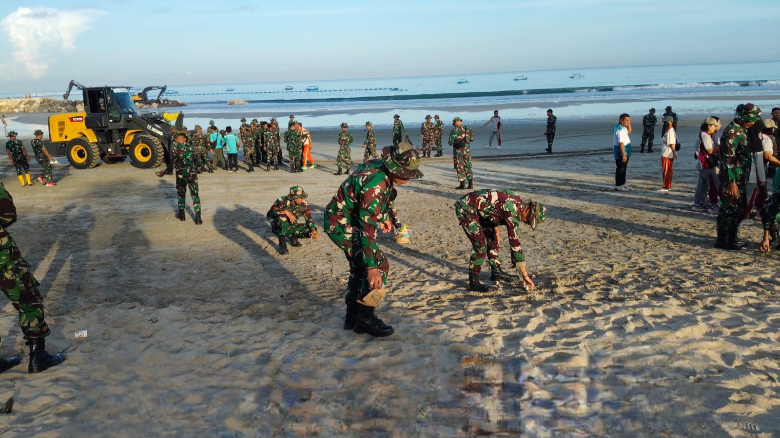 Para personel bekerja gotong royong mengumpulkan berbagai jenis sampah yang menumpuk di bibir pantai, mulai dari sampah plastik, sisa kayu, hingga bambu. Sampah-sampah tersebut dikumpulkan di titik-titik tertentu guna mempermudah proses pengangkutan oleh alat berat, termasuk loader dan crawler dumper yang telah disiapkan.