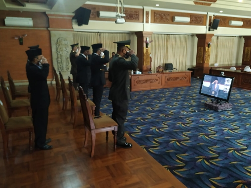 Wali Kota Denpasar I Gusti Ngurah Jaya Negara bersama Ketua DPRD Denpasar I Gusti Ngurah Gede, dan Forum Koordinasi Pimpinan Daerah (Forkopimda) Denpasar mengikuti penyelenggaraan upacara Bendera secara daring di ruang Praja Utama Kantor Wali Kota Denpasar.