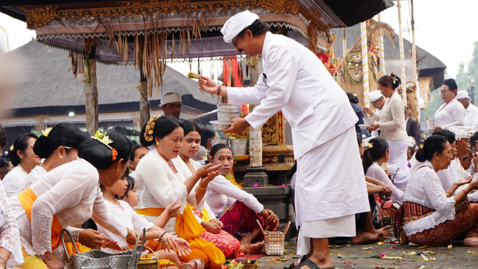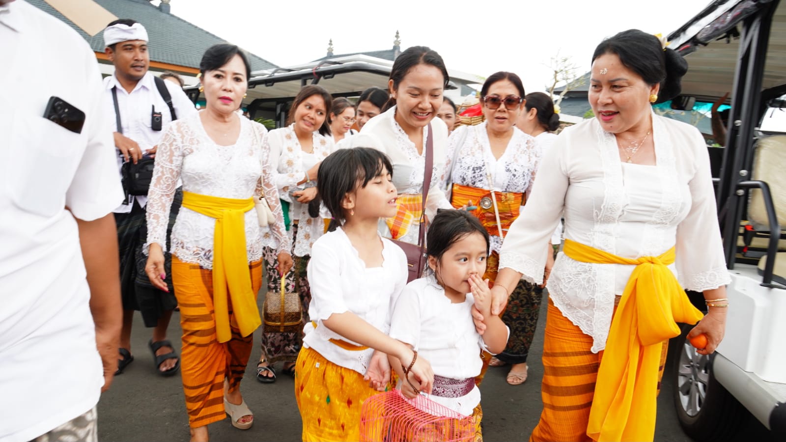 BERITAFAJARTIMUR.COM (KARANGASEM) Ketua Badan Kerja Sama Organisasi Wanita (BKOW) Provinsi Bali, Ny. Seniasih Giri Prasta, menghaturkan sembah bhakti serangkaian Karya Ida Bhatara Turun Kabeh (IBTK) di Pura Agung Besakih, Sabtu (11/4/2026), di tengah meningkatnya jumlah pemedek pada akhir pekan.