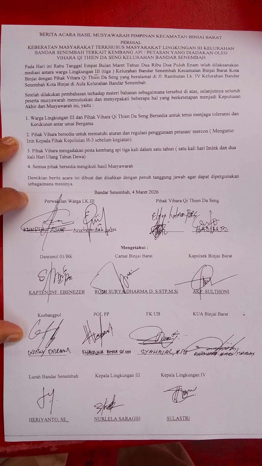 BERITAFAJARTIMUR.COM (Binjai) Mediasi perdana konflik Klenteng Thai Seng Hut Co di Binjai Barat bersama Warga lingkungan 3 yang digelar pada Rabu (4/3/26) dihadiri langsung oleh Ketua Pengurus Klenteng Elton Hotman bersama rekannya dan kubu warga yang berseteru di Kantor Kelurahan Bandar Sinembah, Kec. Binjai Barat, Kota Binjai.