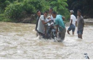 Ket. Foto: Salah satu contoh masyarakat yang membantu mengangkut sepeda menyeberangi sungai Wae Galang saat musim banjir tiba.