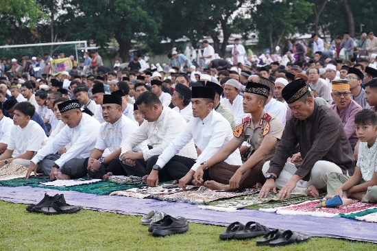 Alhamdulillah kita bersyukur kepada Allah Subhana Wa ta’alah yang telah mempertemukan kita kembali di Hari Raya Idul Fitri 1445 H setelah sebulan penuh kita melaksanakan ibadah puasa dan senantiasa berusaha meningkatkan kualitas Ibadah. Maka pada pagi hari ini kita berharap semua dosa-dosa kita diampuni oleh Allah dan kita kembali kepada fitrahnya sebagaimana Rasulullah Shallallahu alaihi Wasallam, yang berpuasa Ramadhan dengan dasar iman dan ridho Allah maka Allah akan mengampuni semua dosa-dosanya allahu akbar, allahu akbar, allahu akbar,” ujar Khatib Hj Imam Makawi saat memimpin sholat Idul Fitri 1445 H.