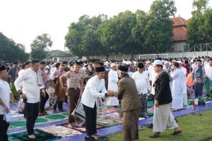 BERITAFAJARTIMUR.COM (Denpasar-BALI) | Pangdam IX/Udayana Mayjen TNI Bambang Trisnohadi didampingi Ketua Persit Kartika Chandra Kirana Daerah IX/Udayana Ny. Dian Bambang Trisnohadi bersama keluarga besar Kodan IX/Udayana dan Umat Muslim wilayah Kota Denpasar melaksanakan Sholat Idul Fitri Tahun 1445 H, pada Rabu (10/4/2024) di Lapangan Makorem 163/Wira Satya, Jln. PB Sudirman, Kota Denpasar.