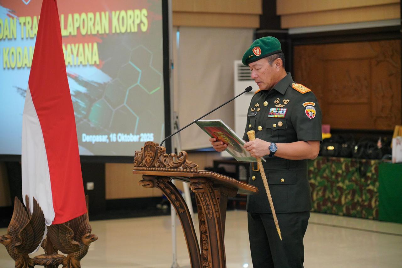 DENPASAR-BERITAFAJARTIMUR.COM, — Panglima Komando Daerah Militer (Pangdam) IX/Udayana, Mayjen TNI Piek Budyakto, memimpin acara serah terima jabatan (Sertijab) dan tradisi laporan korps pejabat Kodam IX/Udayana yang berlangsung di Aula Supardi, Makodam IX/Udayana, Jl. Udayana No.1 Denpasar, Kamis (16/10/2025).