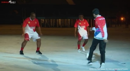 “Bapak Presiden, mari sini, ikut kita,” ajak seorang anak kecil yang mengenakan pakaian adat Papua dan membawa alat musik tifa. Ajakan tersebut disambut senang oleh Kepala Negara yang terlihat tersenyum dan segera menghampirinya untuk memulai bermain bola dengan keempat pemuda di lapangan. Setiap kali Presiden Jokowi menendang bola, penonton menyambutnya dengan riuh dan tepuk tangan.