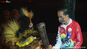 Presiden Jokowi saat menerima alat musik tifa kemudian ditabuh tanda dimulainya PON XX Papua