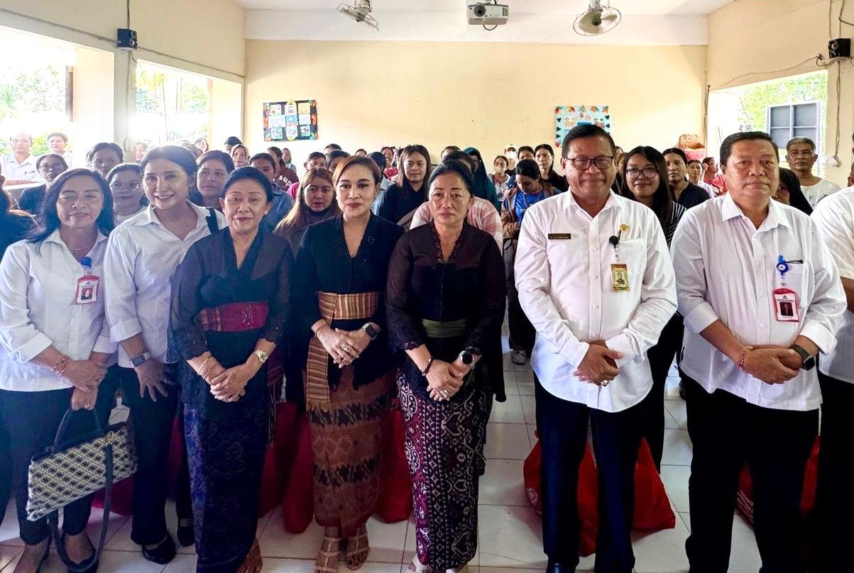 Tim Penggerak PKK Kota Denpasar, dan Perumda Tirta Sewaka Dharma, menyerahkan paket bantuan kepada ratusan orang tua siswa di dua lokasi Sekolah Dasar (SD) di Kelurahan Serangan, Rabu (4/6).