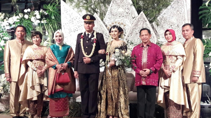 Kapolri Jenderal Tito Karnavian yang mengenakan batik merah maron tampak menghormati seniornya, Komjen Moechgiyarto dengan memberi ucapan selamat sekaligus foto bersama dengan kedua mempelai. Kapolri juga harus menyalami sejumlah perwira lainnya satu persatu sebelum meninggalkan lokasi acara tersebut.