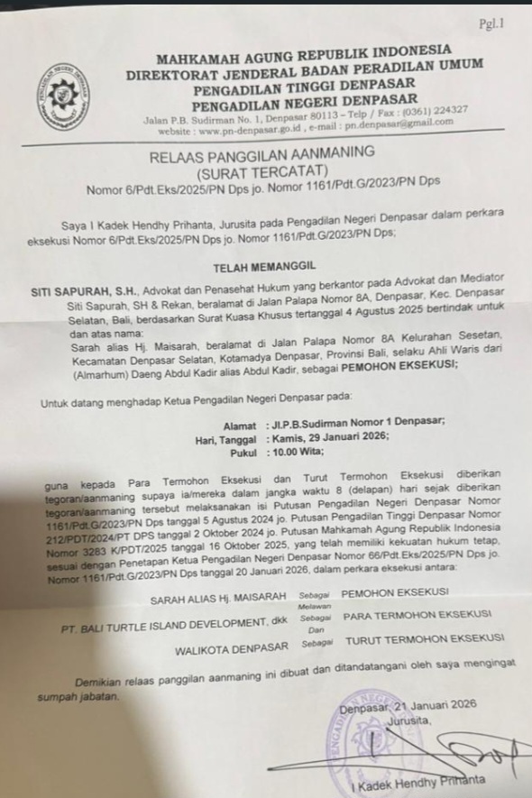 Pengadilan Negeri (PN)Denpasar, berkedudukan di Jl. P.B. Sudirman no. 1 Denpasar, mengeluarkan Relaas Panggilan Aanmaning Nomor 6/Pdt. Eks/2025/PN Dps jo. Nomor 1161/Pdt.G/2023/PN Dps