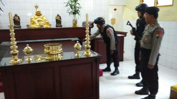 Polres Lumajang menerjunkan aparatnya mensterilisasi kegiatan ibadah Tahun Baru Imlek yang berlokasi di Vihara Maytreya, Jln. Sutoyo No 7 Lumajang, Senin (4/2/2019). Kegiatan ibadah dilakukan pada pukul 21.00 WIB hingga selesai.