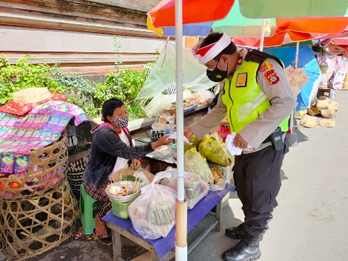 Salah satu pedagang mengapresiasi kegiatan yang dilaksanakan Polres Gianyar di Pasar Lama Gianyar dan berterimakasih atas pembagian masker gratis.(BFT/GIA/Hen)