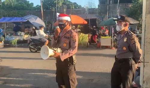 Terlihat pagi ini Senin (16/8/2021) personel Polsek Sukawati Polres Gianyar melaksanakan himbauan dalam rangka perpanjangan PPKM Level-4 wilayah Jawa-Bali kepada pedagang maupun pengunjung di Pasar Dewi Sri Batubulan.