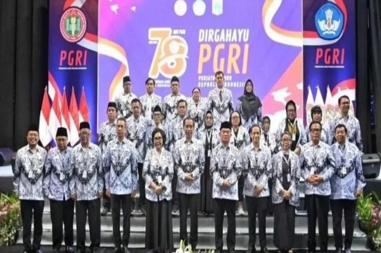 Bersama ribuan guru yang berasal dari seluruh penjuru Republik Indonesia, Presiden Joko Widodo (Jokowi) menghadiri dan mengikuti peringatan Hari Ulang Tahun Persatuan Guru Republik Indonesia (PGRI) ke-78 sekaligus peringatan Hari Guru Nasional (HGN).