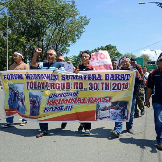 Aksi damai tersebut dilakukan dengan long march dari Gor Agus Salim menuju Kantor Gubernur yang dikawal pihak kepolisian. Sesampai di depan Kntor Gubernur, para wartawan merasa kecewa karena tidak bisa bertemu dengan Gubernur Sumbar Irwan Prayitno dikarenakan sedang dinas diluar daerah. Dalam orasinya, mereka menuntut beberapa hal diantaranya adalah pertama, agar Gubernur Sumbar mencabut kembali Pergub No. 30 tahun 2018. Kedua Stop kriminalisasi Pers. Ketiga, Save Jurnalist Sumbar dan ke Empat Copot Kabiro Humas Pemprov Sumbar.
