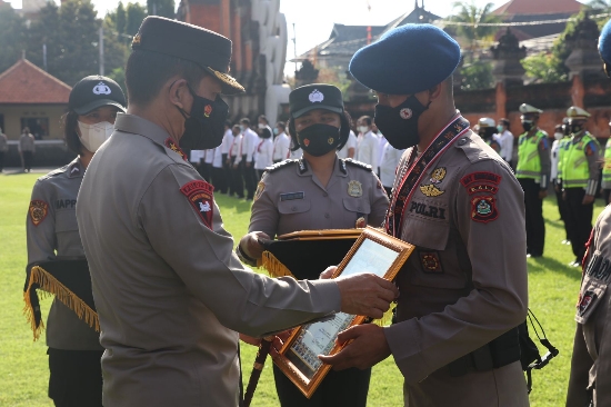 Pemberian penghargaan bagi personel yang meraih medali pada bidang olahraga tersebut digelar di halaman depan Polda Bali pada, Senin (22/11/2021). saat Kapolda Bali mengambil apel jam pimpinan.