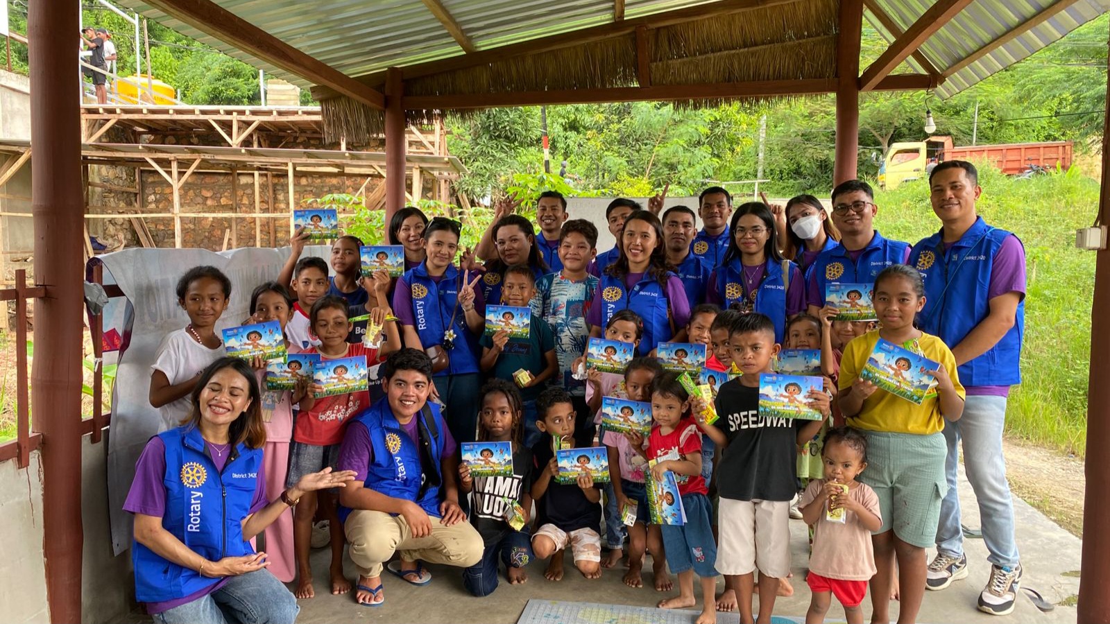 Di lokasi taman baca, para anggota Rotary Club membagikan buku bacaan anak berwarna berjudul “Petualangan Edu di NTT”.