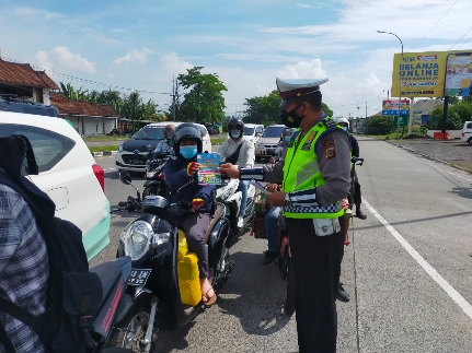 Beritafajartimur.com (Gianyar-BALI) | Satlantas Polres Gianyar melaksanakan kegiatan himbauan dan sosialisasi tertib berlalu lintas, termasuk juga sosialisasi protokol kesehatan dan penempelan stiker kepada pengendara yang melintas di Simpang Saba Blahbatuh, Selasa (2/11/2021).