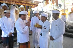 BERITAFAJARTIMUR.COM (Denpasar), Sekda Kota Denpasar, Ida Bagus Alit Wiradana mewakili Wali Kota Denpasar, I Gusti Ngurah Jaya Negara menghadiri sekaligus serangkaian Puncak Karya Ngenteg Linggih Padudusan Alit Catur Rebah, Mecaru Rsi Gana lan Manca Panca Sata di Pura Kahyangan lan Prajapati Dalem Tegeh Gumi, Desa Adat Denpasar bertepatan dengan Rahina Tumpek Wayang, Sabtu (16/8). Upacara tersebut dilaksanakan guna melengkapi rangkaian upacara setelah proses renovasi dan ngeratep pelawatan tuntas dilaksanakan.Â