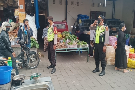 Tiada Henti, Polsek Blahbatuh Giatkan Imbauan Prokes di Pasar Rakyat