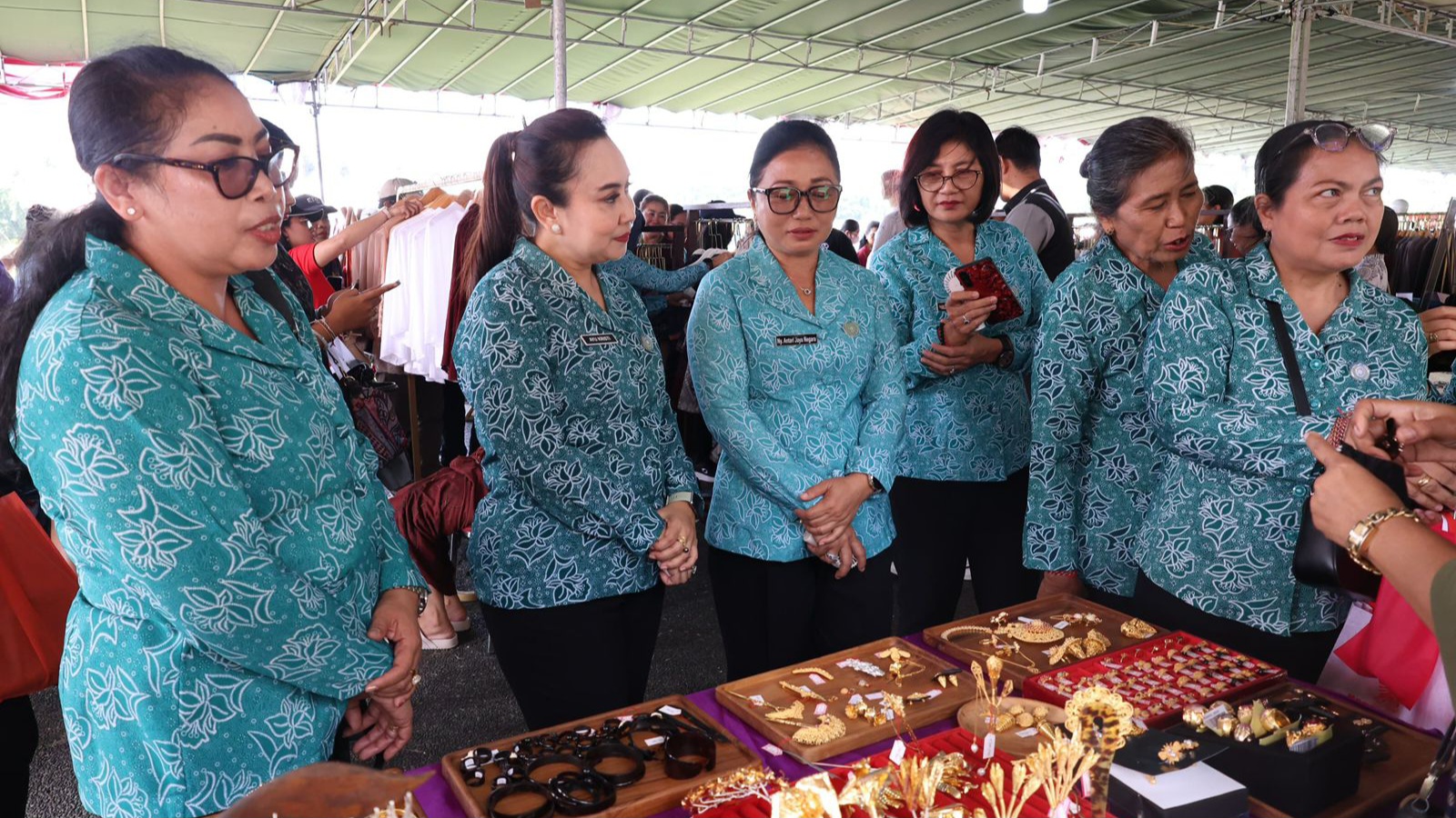 Ket. foto: Ketua Tim Penggerak PKK Kota Denpasar, Ny. Sagung Antari Jaya Negara bersama Sekretaris I TP PKK Kota Denpasar, Ny. Ayu Kristi Arya Wibawa saat menghadiri kegiatan Pasar Rakyat Tim Penggerak PKK Provinsi Bali bertajuk Berbelanja Berbagi yang digelar di Lapangan Niti Mandala Renon, Denpasar, Jumat (13/3).