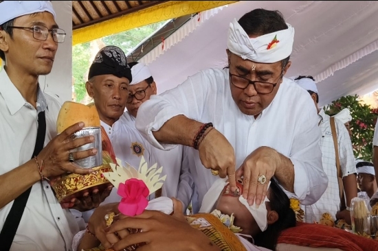 Ket Foto: Wali Kota Denpasar, IGN. Jaya Negara saat ngayah nyangging pada Pewintenan dan Metatah Masal PHDI di Pura Agung Loka Natha.